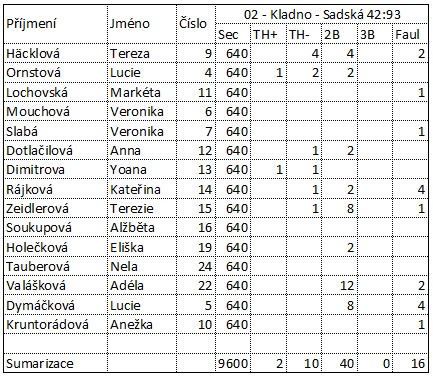 A pojďme chválit. Lucku za rozehrávku a za přesné nahrávky. Lůcu za bojovnost, obranu a chytrou hru v útoku. Verču M. za obranu. Verču S. za obranu i útok. Terku H. za rozehrávku a chytrou hru v útoku. Anežku za rozehru, útok a hlavně za obranu. Maky za bojovnost a rozehrávku. Aničku za obranu i útočnou hru. Yoni za zlepšení v orientaci na palubovce. Kačku za útočné akce a velké zlepšení v obraně. Terku Z. za přemýšlení nad svou hrou, rozehrávkou a zlepšení dvojtaktů. Bětku za obranu. Elišku za odvahu začít hrát důrazně. Áďu za orientaci na hřišti a zlepšení v obraně. Nelu za obranu a přemýšlení na hřišti.