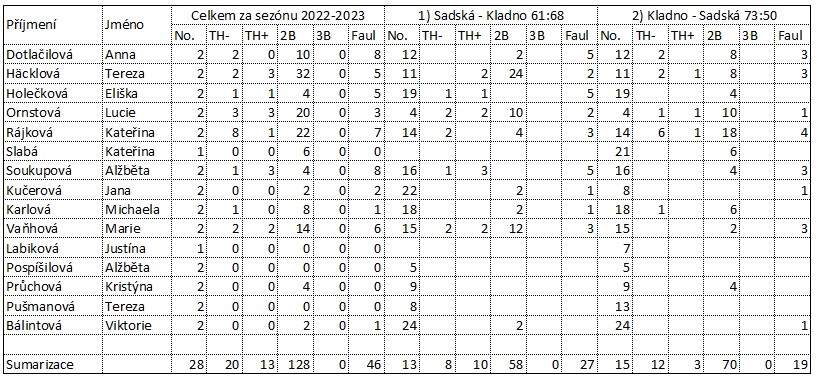 V sobotním utkání v Sadské jsme měli skvělý nástup. Ujali jsme se vedení hned v úvodu a postupně jsme náskok zvyšovali. Na konci první čtvrtiny jsme již vedli o 8 bodů. Ve druhé čtvrtině jsme až do 6. minuty udržovali cca desetibodový náskok, který se nám podařilo udržet až do konce první půle, která nakonec skončila naším 12 bodovým vedením. Třetí čtvrtina byla vyrovnaná, na jejím konci byl bodový rozdíl jako v poločase. Tento náskok jsme si udrželi až do 3. minuty poslední čtvrtiny. Pak ale na naše hráčky začala trochu dopadat tíha utkání a částečně i vyčerpání z těžkého zápasu. S tím se u nás začala pomalu projevovat nesoustředěnost a nepřesnost a hráčky Sadské se o to více snažily utkání zvrátit ve svůj prospěch. Rozdíl skóre se dlouho pohyboval mezi 6 až 8 body, v závěru dokonce pouze o 5 bodů. Poslední koš jsme ale vsítili my a tak utkání nakonec skončilo naším vítězstvím 61:68. Přestože podalo naše družstvo skvělý výkon jako celek a všechny hráčky si zaslouží velkou pochvalu, dovolím si tu vypíchnout excelentní výkon Terky Häcklové, která pronikala do vosího hnízda jako nůž máslem, a tak v utkání nastřílela úžasných 26 bodů! A hned v závěsu za ní Mája Vaňhová se 14 body a Lucka Ornstová se 12 body. Ještě se povedlo skórovat Kačce Rájkové (4), Bětce Soukupové (3), Aničce Dotlačilové (2), Janě Kučerové (2), Míše Karlové (2), Viki Bálintové (2) a Elišce Holečkové (1).