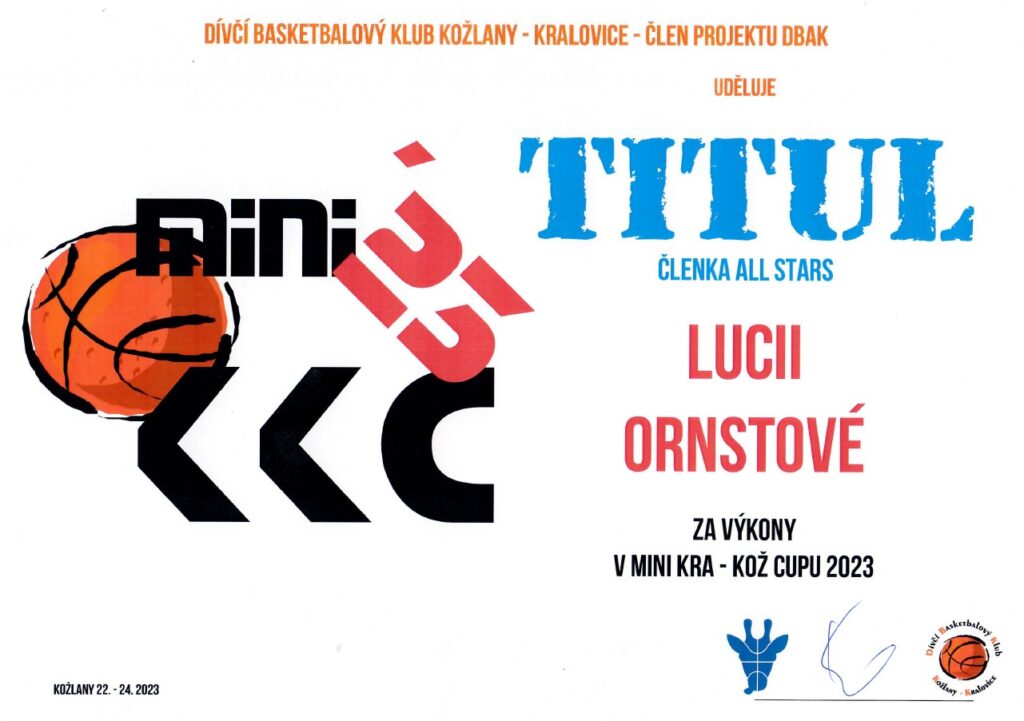Na základě hlasování všech trenérů i hráček jednotlivých družstev se jednou z pěti členek All Stars Mini Kra-Kož Cup 2023 stala Lucie Ornstová. MVP hráčkou turnaje se stala Beata Přibylová.